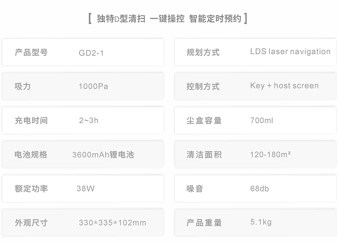 LDS导航技术,能够实时对房屋进行3D立体扫描,并实时更新构建完整的房屋地图,并通过强大的智能算法SLAM,准确定位,制定出高效率的清扫路线,全面规划清扫,不迷路。多组传感器,95%高覆盖清扫,高效率清洁,智能分区规划式清扫 Spinflow澎湃真空吸尘技术,超宽胶毛一体尘刷,1.7小时快速充电,干净省心,独特D型设计,高效滤网,700m特大水洗尘盒,断点续扫,自动回充,7*24预约功能。