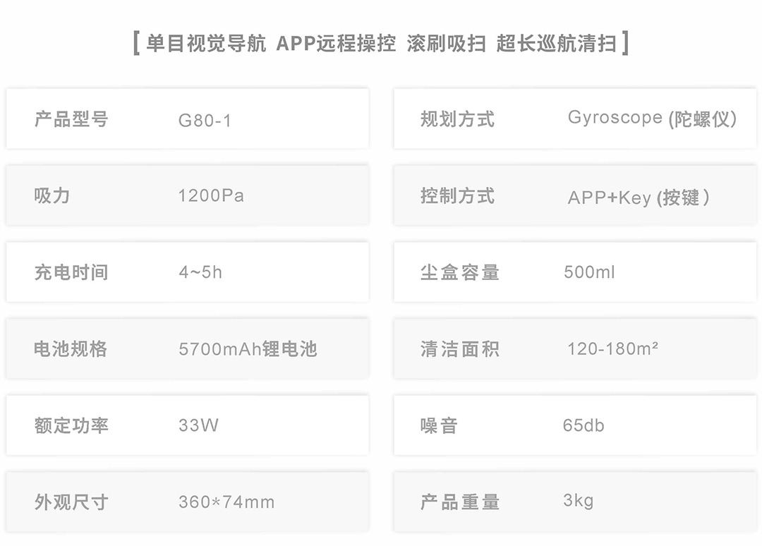 根据深度相机视觉技术建立的数字地图,聪明地规划出清洁路线,先沿墙边再扫中间,而不是四处乱撞。拥有路线记忆功能,不断规划调整最优路线,越用越聪明,效率越高。机器有断点记忆清扫的功能。当机器人一次没有扫完,第二次开启时机器人会重返第一次没扫完的地方接着扫。通过自带的深度相机视觉导航技术扫描并定位充电座,识别它在地图上的位置。当房间全部清扫完成,仅管隔着多个房间也能找到充电座并充电。就算家里面突然停电,机器人也能识别找到充电座,避免了机器人藏在沙发底下找不到的尴尬。
